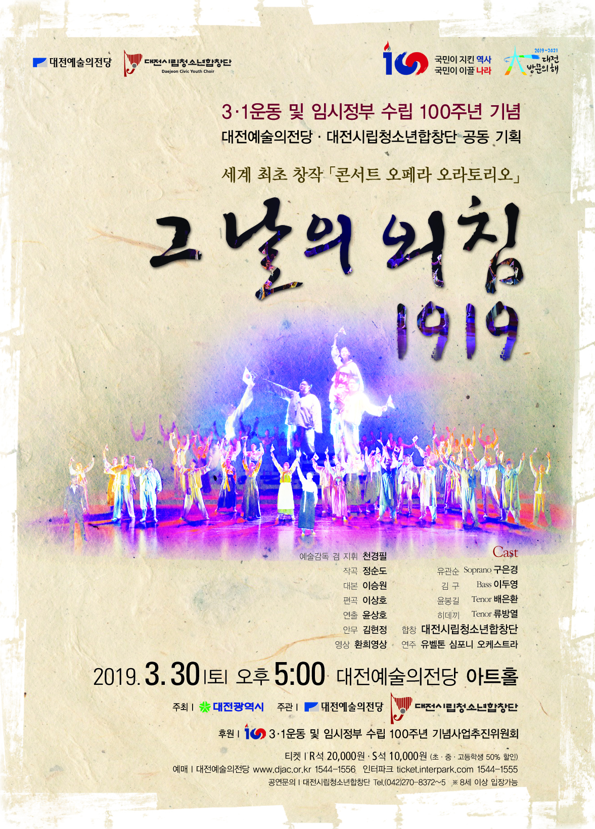 시공을 넘나들며 독립운동가들의 삶을 조명한 ‘그 날의 외침 1919’는 드디어 독립을 쟁취하는 장면에 이르고 환호하는 군중을 표현한다. 이어 유관순, 김구, 윤봉길의 삼중창과 합창으로 대미를 장식한다.