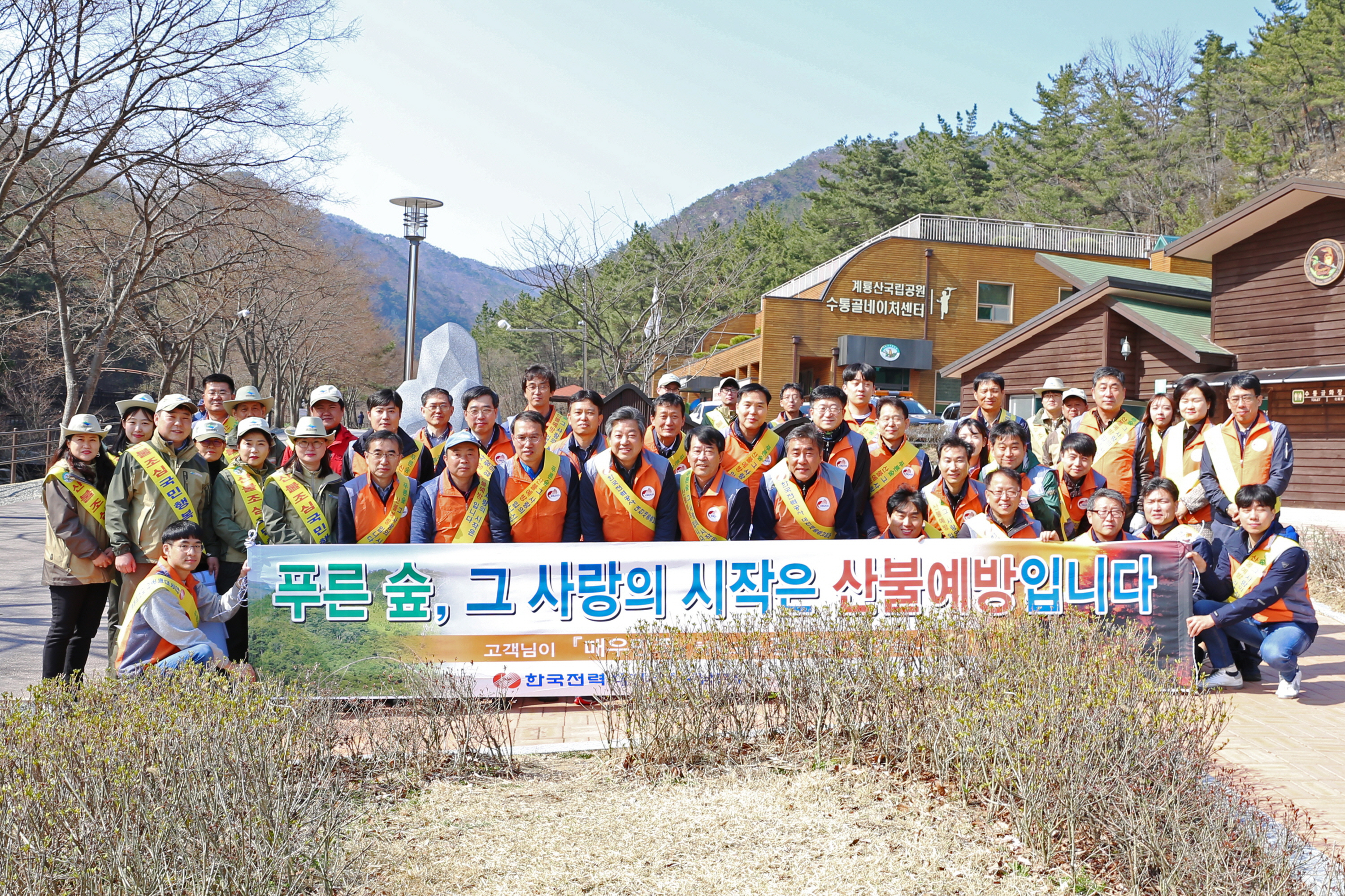 한전 대전세종충남본부가 지난 29일 대전지역 계룡산, 계족산 일원에서 국립공원공단과 합동으로 봄철 건조기 산불예방을 위한 홍보활동을 시행한 가운데 참가자들이 홍보활동을 마치고 기념사진을 촬영하고 있다.