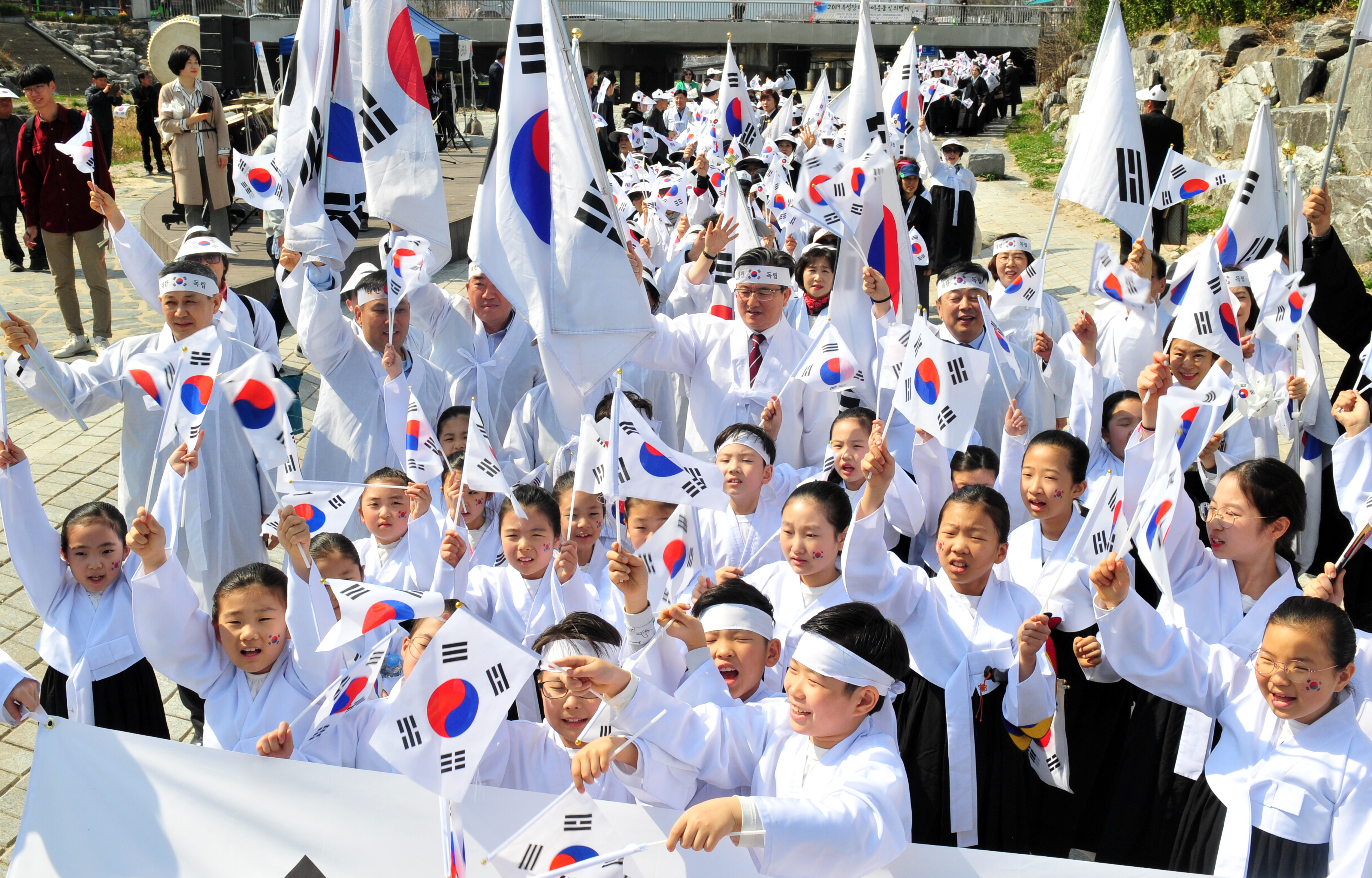 이어 만세삼창과 함께 거리행진이 시작됐다. 행사장 주변 사람들이 몰려들 정도로 우렁찬 “대한독립만세” 함성이 거리를 가득 채웠다. 행진 중간에도 징과 꽹과리를 치며 흥을 돋우고 화려한 퍼포먼스가 이어지자 장을 보러온 시민들도 합류해 100년 전 그날의 의미를 되새겼다.