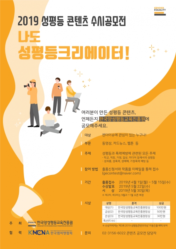 한국양성평등교육진흥원은 내달 15일까지 제1차 나도 성평등크리에이터 수시공모전을 실시한다.