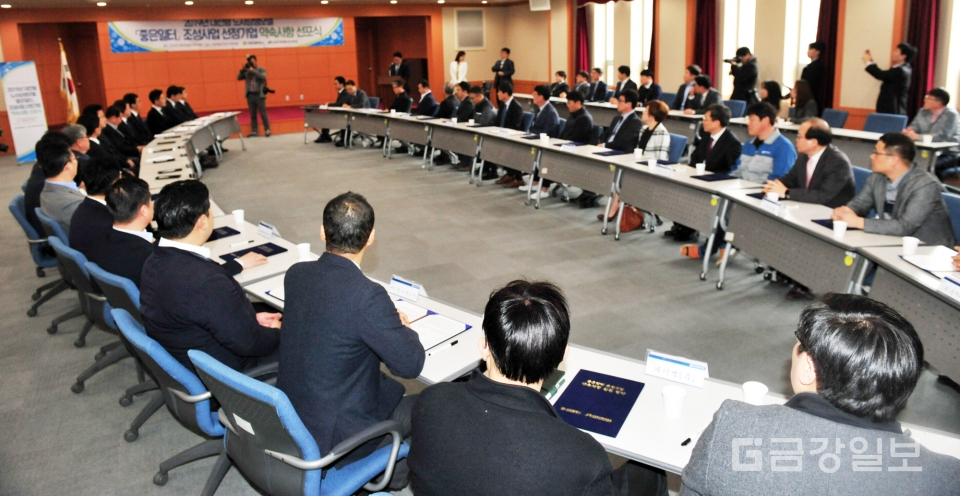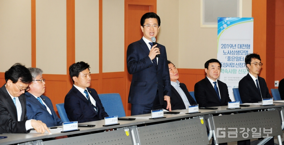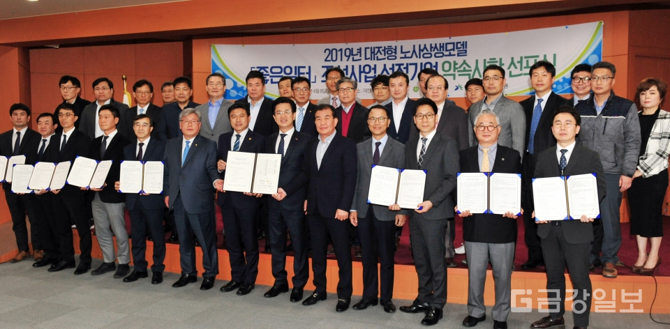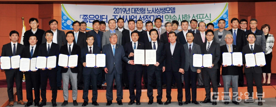 2019년 대전형 노사상생모델 "좋은일터" 조성사업 시민선포식이 8일 대전예술의전당 컨벤션홀에서 열려 허태정 시장과 김종천 시의회의장,이명로 대전지방고용노동청장, 강도묵 대전충남경영자총협회 회장 등 관계자들이 협약서에 서명후 포즈를 취하고 있다. 전우용 기자 yongdsc@ggilbo.com