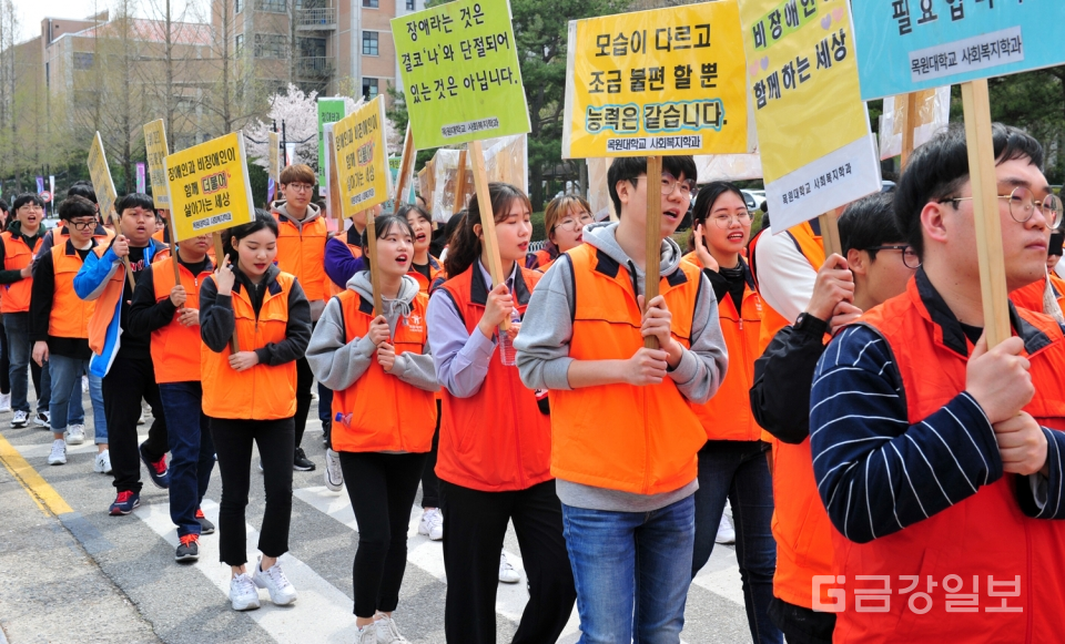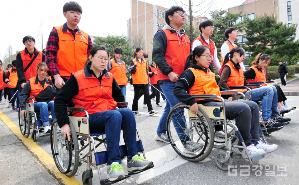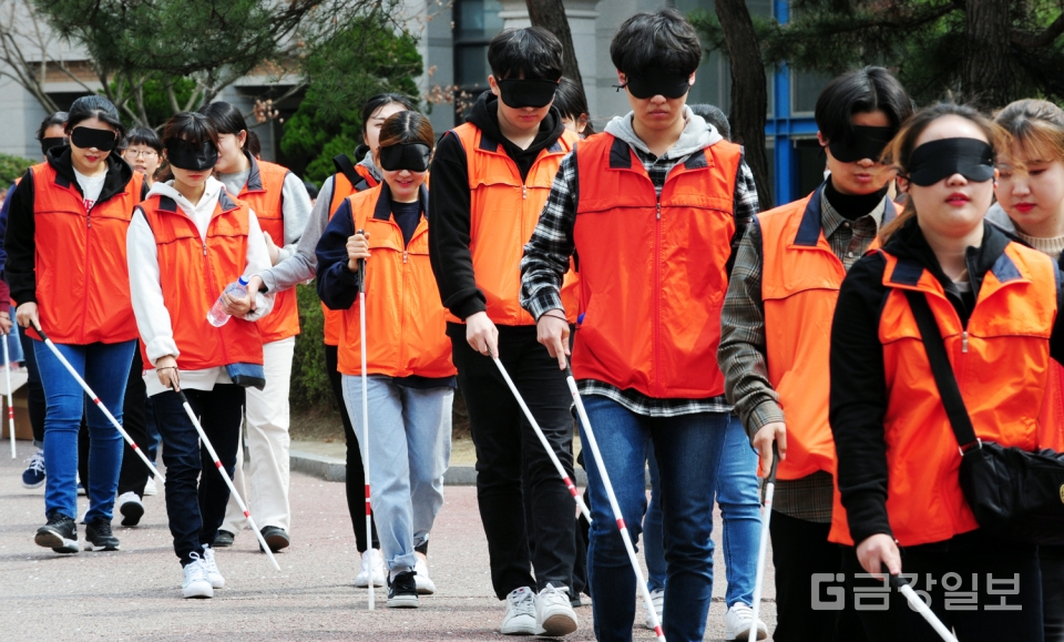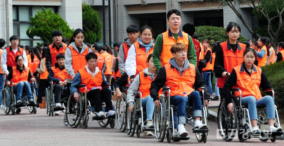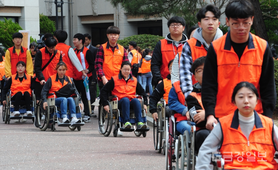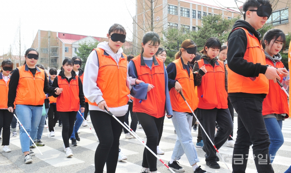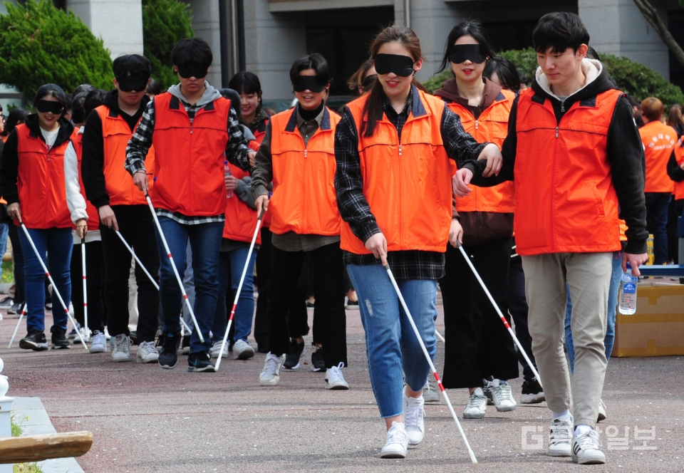 제24회 장애체험의 장 행사가 11일 목원대 인문대학광장에서 열려 사회복지학과 학생들이 휠체어체험 및 눈을 가린채 지팡이에 의존하는 시각장애체험으로 가두행진을 하고 있다. 전우용 기자 yongdsc@ggillbo.com