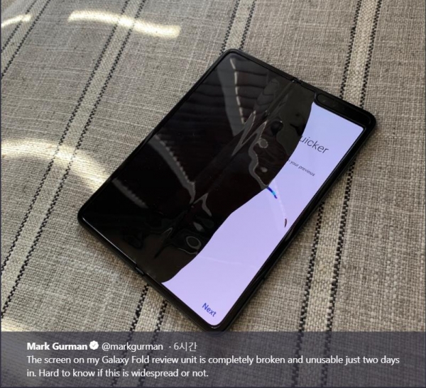 리뷰를 진행한 더버지, 블룸버그, CNBC 등에 따르면 사용 1~2일 만에 갤럭시 폴드의 한쪽 화면이 꺼지거나 깜빡거리는 현상, 그리고 스크린에 줄이 가는 현상 등이 발생했다고 17일 밝혔다.