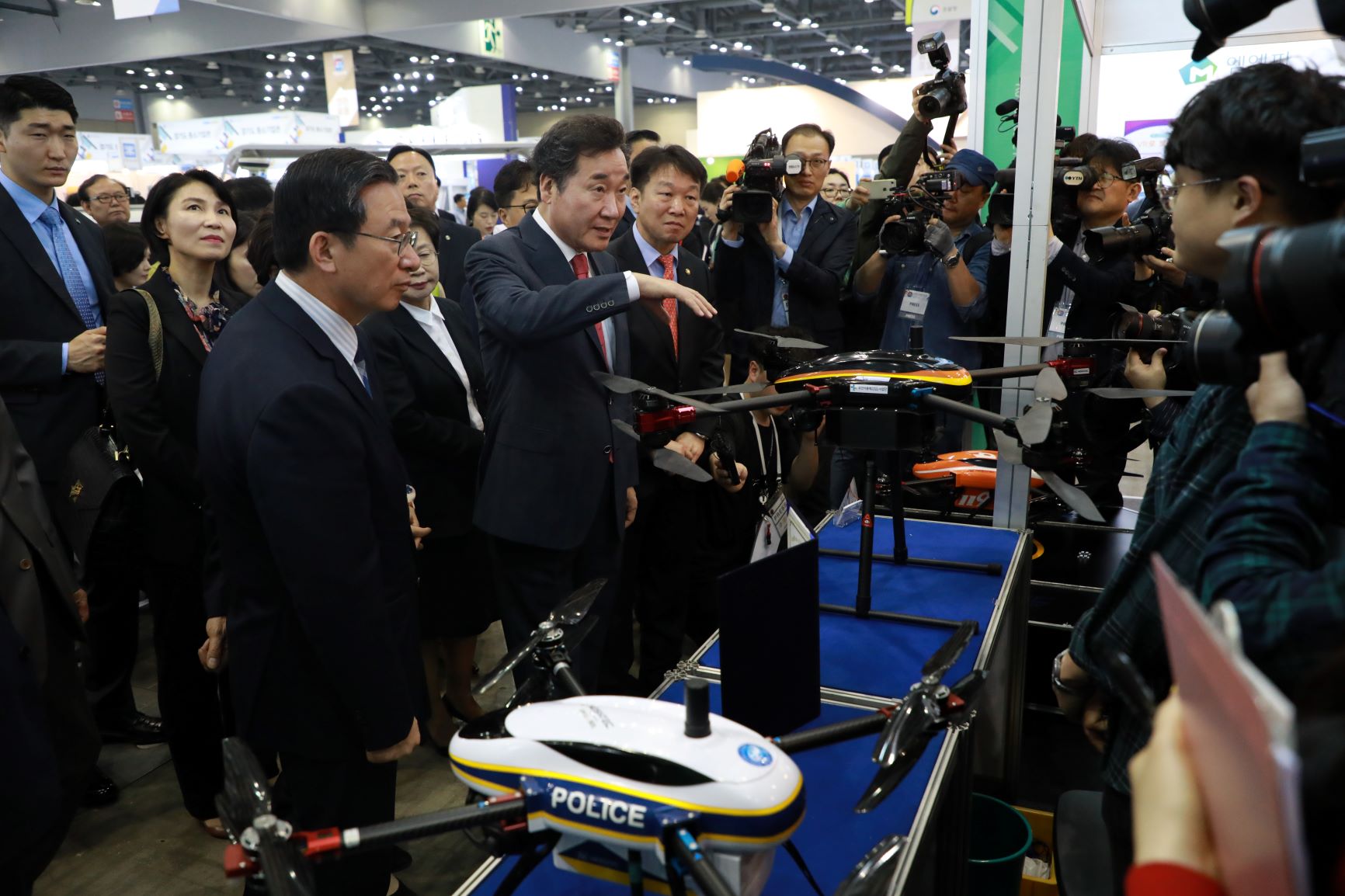 (왼쪽부터) 정성호 기획재정위원장, 이낙연 국무총리, 정무경 조달청장이 24일 킨텍스에서 열린 제20회 코리아 나라장터 엑스포에서 올해에는 드론, 가상현실(VR), 3D프린터, 자율주행차 등 연구개발(R&D) 신기술제품 등을 살펴보고 있다.