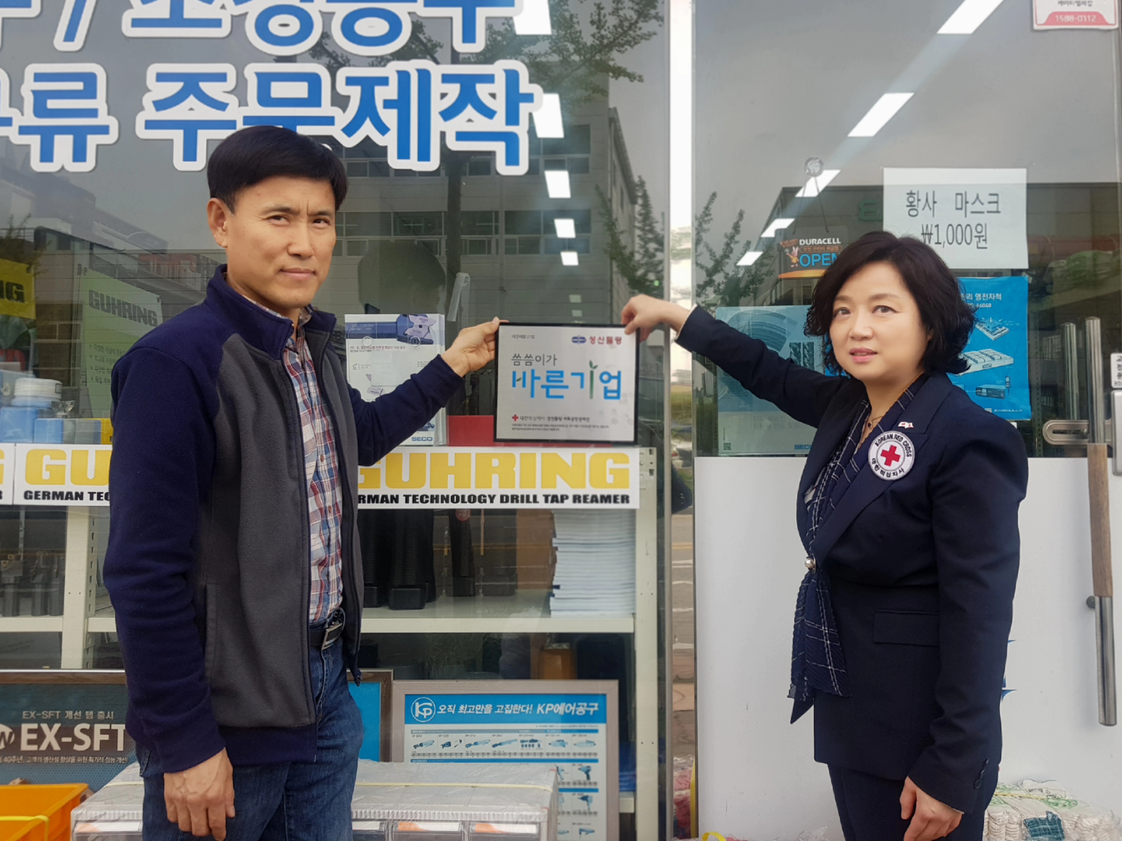 절삭공구, 초경공구 전문 업체 ㈜성신툴링 성복경 대표(왼쪽)가 적십자 대전세종지사 나눔문화 확산 캠페인 ‘씀씀이가 바른기업’ 캠페인에 동참하며 최현복 사무처장과 현판식에서 기념촬영을 하고 있다. ‘씀씀이가 바른기업’은 대한적십자사에 월 10만 원 이상을 정기적으로 후원하는 기업으로, 후원금은 대전세종 지역의 복지사각지대에 빠진 위기가정을 위한 긴급지원에 사용된다. 대한적십자사 대전세종지사 제공
