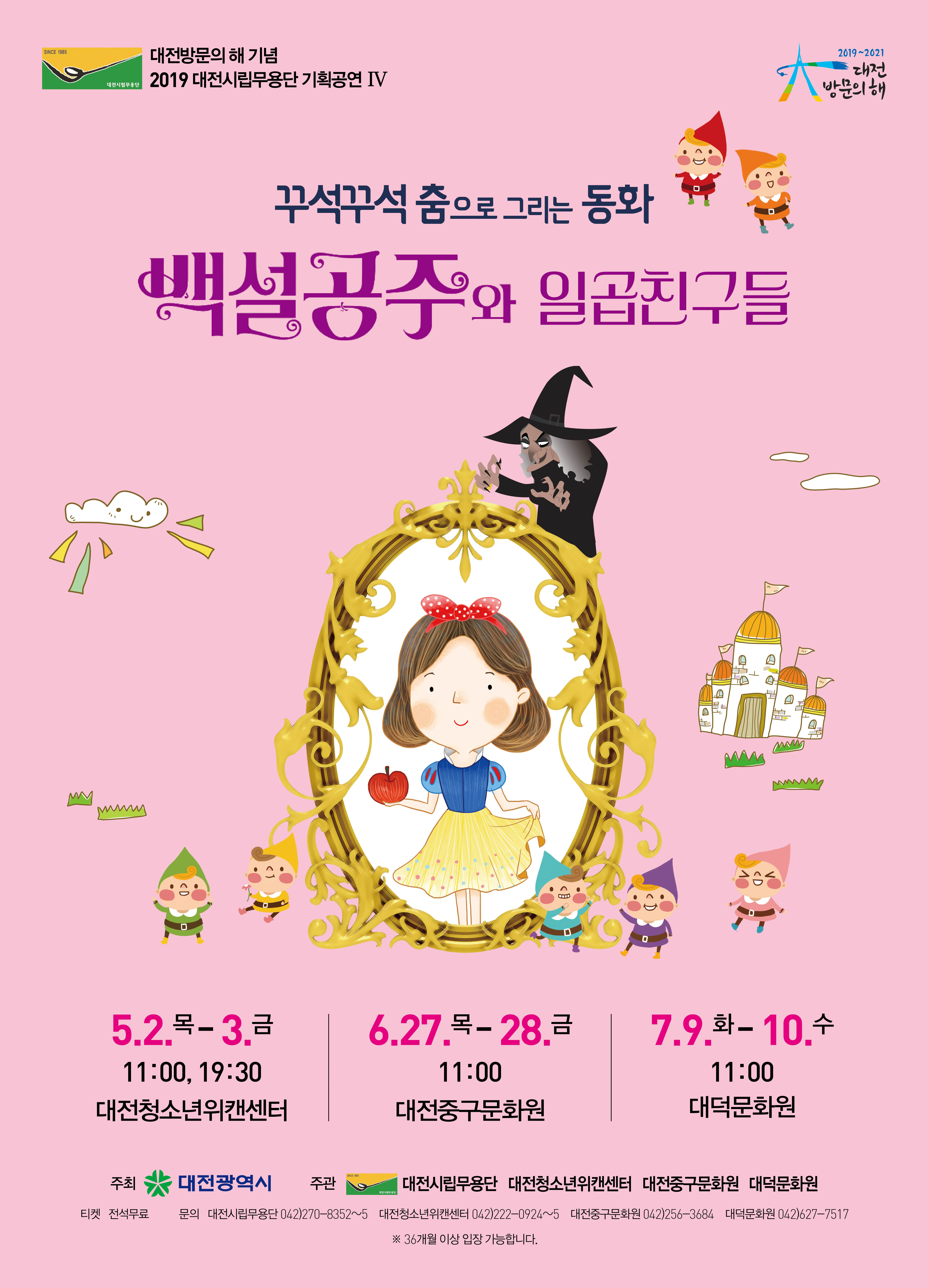 대전시립무용단이 원도심을 활성화하고 어린이들의 감성발달을 위해 마련한 기획공연 IV '꾸석꾸석 춤으로 그리는 동화 백설공주와 일곱친구들’이 5월부터 7월까지 대전청소년위캔센터(5월 2~3일), 대전중구문화원(6월 27~28일), 대덕문화원(7월 9~10일)에서 펼쳐진다.