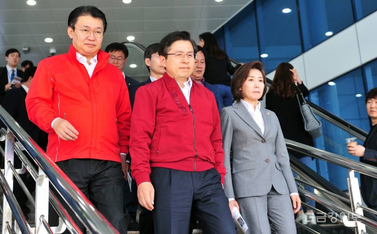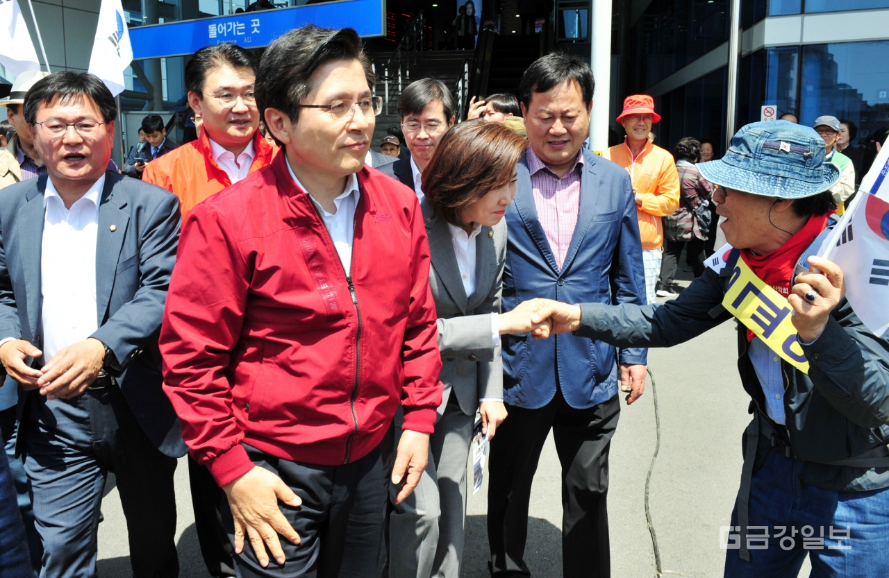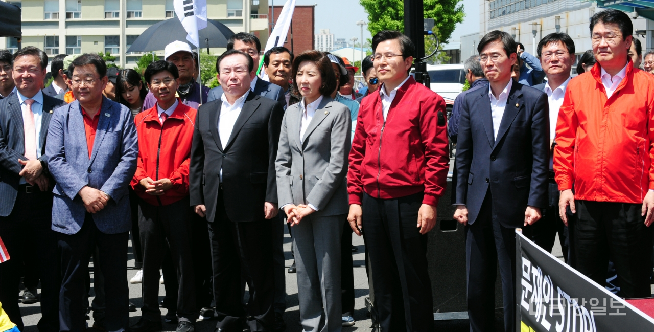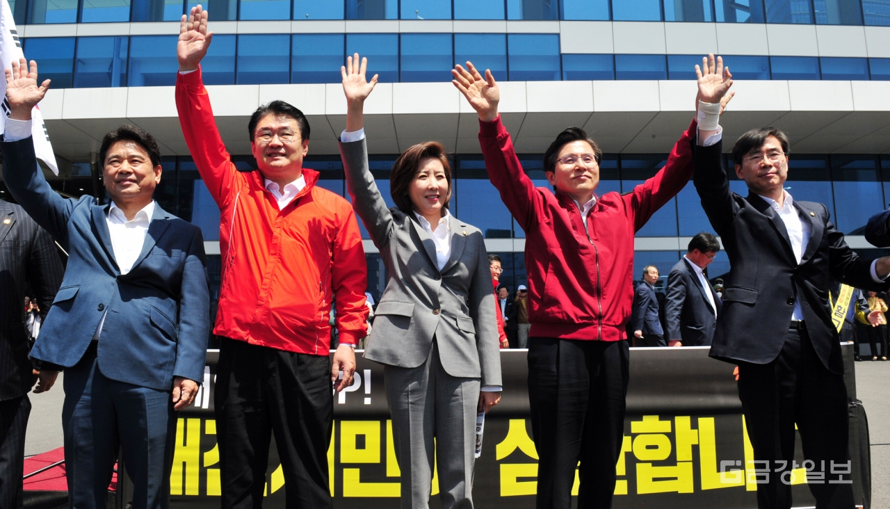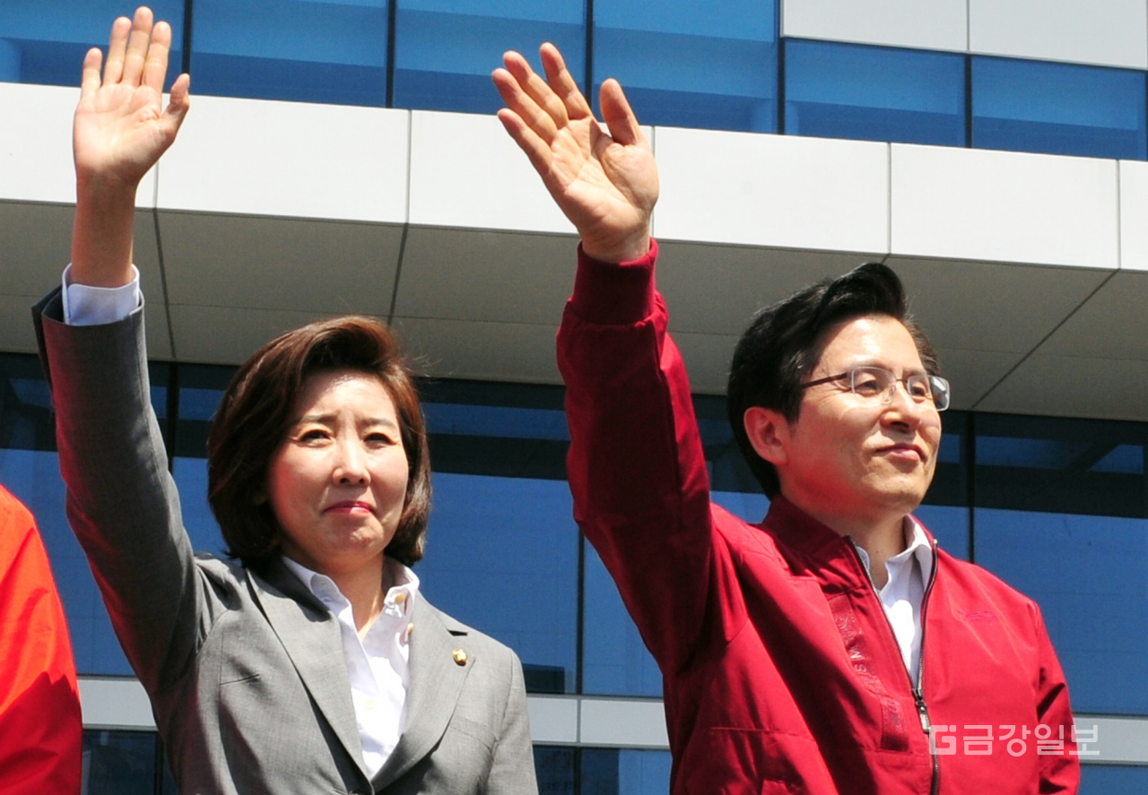 자유한국당 황교안 대표와 나경원 원내대표가 2일 대전역광장에서 패스트트랙 지정의 문제점을 알리기위해 경부선 투쟁에 나선 가운데 대전시민들에게 손을 들어 인사하고 있다. 전우용 기자 yongdsc@ggilbo.copm 자유한국당 황교안 대표와 나경원 원내대표가 2일 대전역광장에서 패스트트랙 지정의 문제점을 알리기위해 경부선 투쟁에 나선 가운데 대전시민들에게 손을 들어 인사하고 있다. 전우용 기자 yongdsc@ggilbo.copm