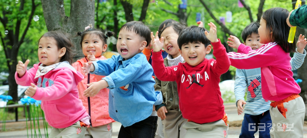 미래를 짊어지고 나아갈 어린이는 이 나라의 보배다. 5월가정의달이자 어린이날을 앞두고 2일 대전 서구 보라매공원에서 비눗방울을 쫓아다니며 뛰노는 서구청 어린이집 생들의 환한 미소를 짓고 있다. 전우용 기자 yongdsc@ggilbo.com
