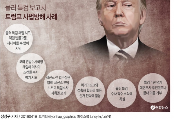 사법방해 혐의의 경우 범죄 혐의가 없다는 결론에 이르지 못했다면서도 그렇다고 트럼프 대통령이 무혐의라고 판단한 것도 아니라는 애매한 입장을 밝혔다.