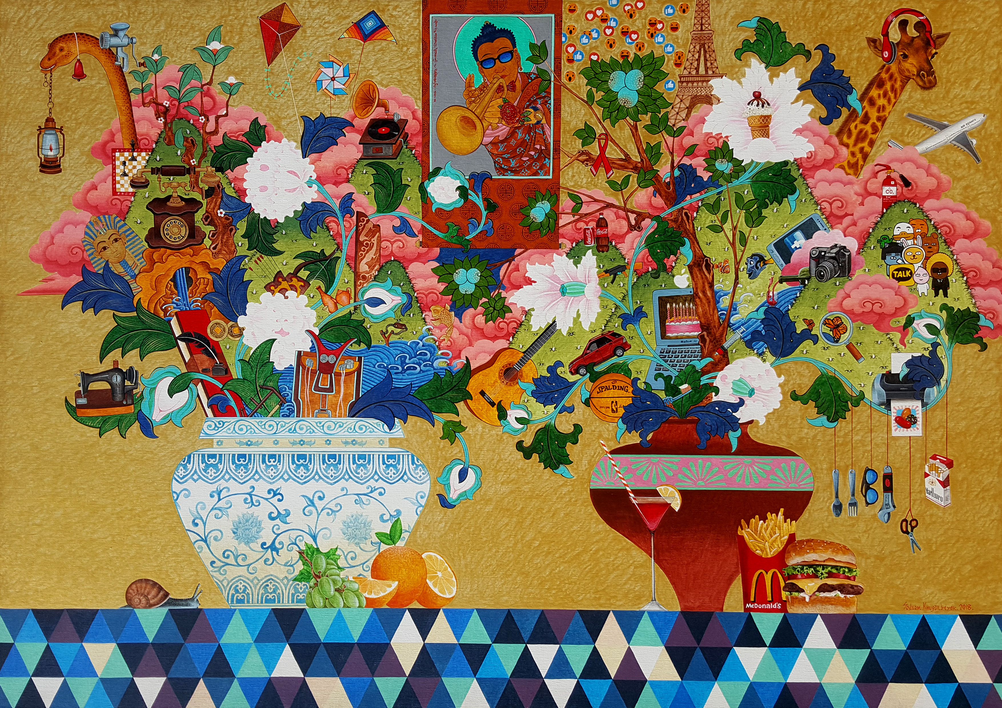 화병 두 개에 자본의 꽃들이 만개했다. 차고 넘쳐 화병에 들어가지 못한 꽃들도 보인다. 그런데 이 작품에 등장하는 꽃은 꽃이 아니다. 향기도 색도 없는 꽃이 화병 속에 들어가 화려하게 피어있지만 자연이 만든 것이 아니라 인간이 만들었다.