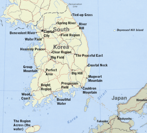 인상적인 지명을 보면 물 수(水)에 언덕 원(原)을 쓰는 수원(水原)의 경우 '워터 필드'(Water Field), 클 대(大)에 밭 전(田)을 쓰는 대전(大田)은 '빅 필드'(Big Field), 강 강(江)에 언덕 릉(陵)을 쓰는 강릉은 '리버 힐'(River Hill)로 표현하고 있다.