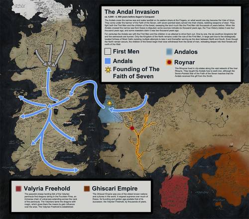 그 때 또 다른 대륙인 에소스의 남부에서는 발라리안인들이 드래곤을 길들이는데 성공했고, 이들은 드래곤과 강력한 마법을 기반으로 에소스 대륙 최초 제국인 ‘기스카르’를 멸망시켰고 에소스 대륙 서부를 장악했고 북부로 진격한다. 이에 위협을 느낀 ‘안달족’이란 부족은 바다를 건너 웨스트로스 대륙으로의 대이주를 시작했다.