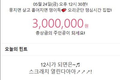 대국민 퀴즈쇼 잼라이브 오늘의 힌트는 '12시가 되면은~스크래치 열린다아아'이다.