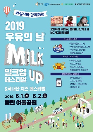 우유자조금관리위원회(위원장 이승호)와 경기도 화성시(시장 서철모)는 오는 6월 1일(토)부터 2일(일)까지 이틀간 경기도 화성시 동탄여울공원 일대에서 <2019 우유의 날 (MILK UP Festival) & 국내산 치즈 페스티벌>을 개최한다.