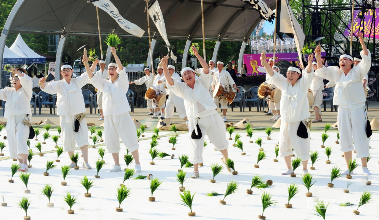 숯뱅이두레 시연이 지난 24일 대전 서구 샘머리공원에서 열려 복장을 갖춘 두레 기능인과 탄방동 지역 원로들이 논매기를 하며 흥겹게 시연을 선보이고 있다. 숯뱅이두레는 영농이 기계화 되면서 전통두레가 쇠퇴, 탄방동 지역 원로들의 중지를 모아 숯뱅이두레를 발굴, 복원해 여름철 땡볕아래서 일하는 논매기만 두레를 짜서 이어왔다고 전한다. 전우용 기자 yongdsc@ggilbo.com