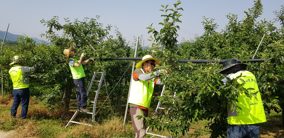 농협네트웍스 대전충남지사 관계자들이 4일 사과 적과시기를 맞아 충남 논산 가야곡면 소재 사과 농가를 찾아 농촌 일손돕기 봉사활동을 벌이고 있다. 농협네트웍스는 봉사활동과 더불어 노후 농가의 환경개선공사를 진행했다. 농협네트웍스 제공