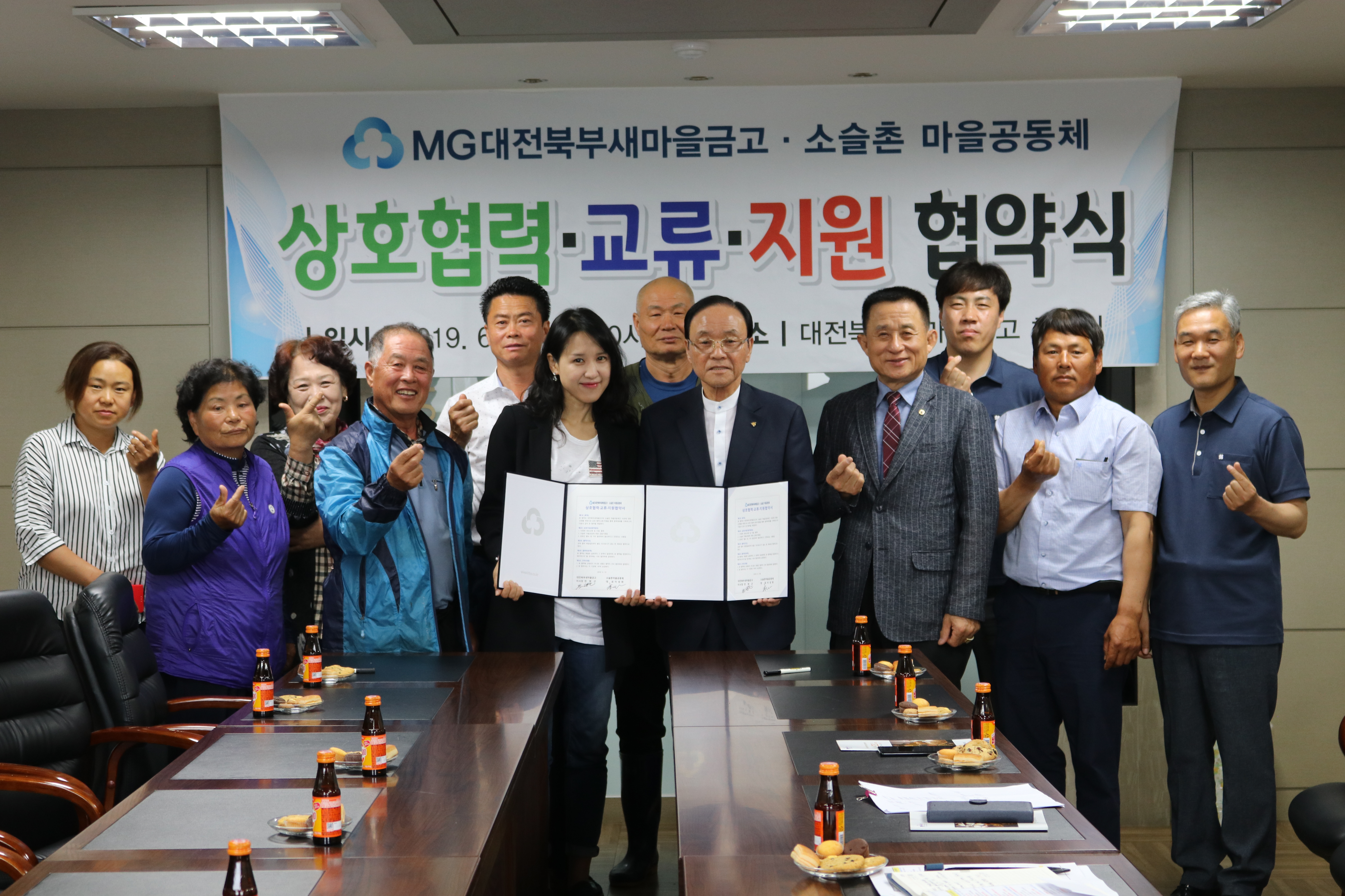 전영근 대전북부새마을금고 이사장(앞 줄 오른쪽 네 번째)과 이성희 대청호 소슬촌마을공동체 대표(앞줄 오른쪽 다섯 번째)가 10일 북부새마을금고에서 상호협력·교류 지원을 위한 협약을 체결하고 있다. 대청호 소슬촌마을공동체는 대청호 주변 5개 마을 주민 40여 명이 참여해 우리 농산물로 50여 가지를 생산하는 마을공동체다. 대전북부새마을금고 제공