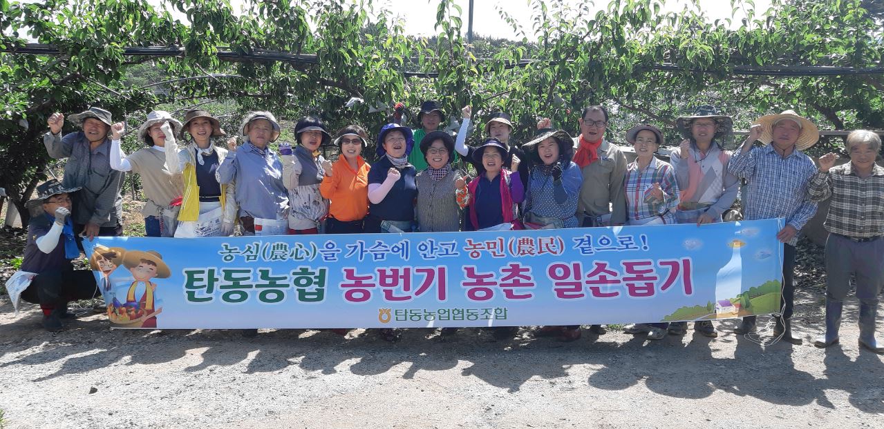 대전 탄동농협 이병렬 조합장(왼쪽 다섯 번째)와 임직원 20여 명이 11일 유성구 하기동의 새미래 농장을 찾아 배봉지 싸기 등 부족한 일손을 돕고 기념사진을 촬영하고 있다. 농협중앙회 대전지역본부 제공