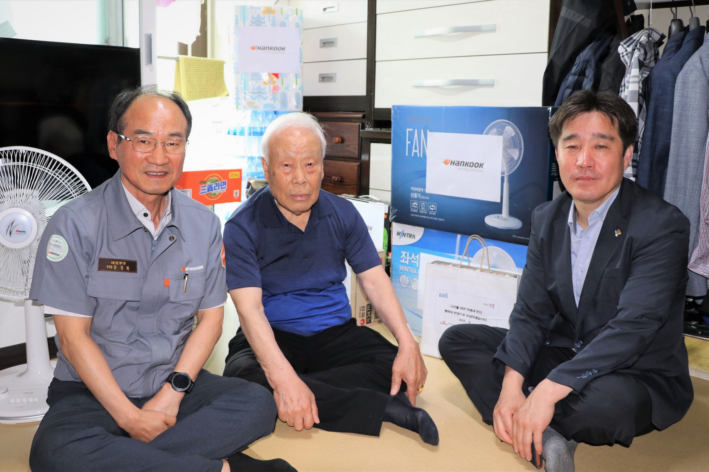 (왼쪽부터) 윤정록 한국타이어 대전공장장이 지난 10일 호국보훈의 달을 맞아 신남우 국가유공자를 찾아뵙고 이남일 대전지방보훈청장과 기념사진을 찍고 있다. 윤 공장장은 지역의 보훈대상 독거노인 가정을 방문해 쌀과 생수 등 필수품을 전달했다. 한국타이어앤테크놀로지 제공