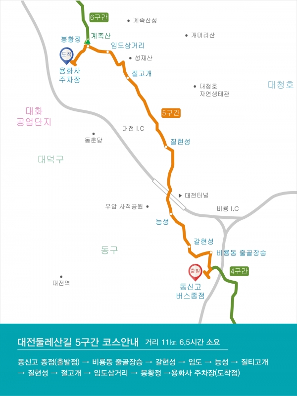 1∼4구간과 비교하면 훨씬 수월하게 산행을 즐길 수 있다. 계족산 임도삼거리에서 봉황정에 오르는 코스가 급경사라 다소 힘에 부치지만 전체적으로 수월하게 산행을 즐길 수 있다. 그래서 공식구간엔 포함돼 있지 않지만 계족산성까지 코스에 포함시키는 선택도 할 수 있다. 중간 중간 산성에서 엿볼 수 있는 역사의 흔적과 ‘내륙의 다도해’로 불리는 대청호반 풍경이 어우러져 색다른 산행의 즐거움을 선사한다. 시원하게 펼쳐진 대전 도심 전경은 덤이다.