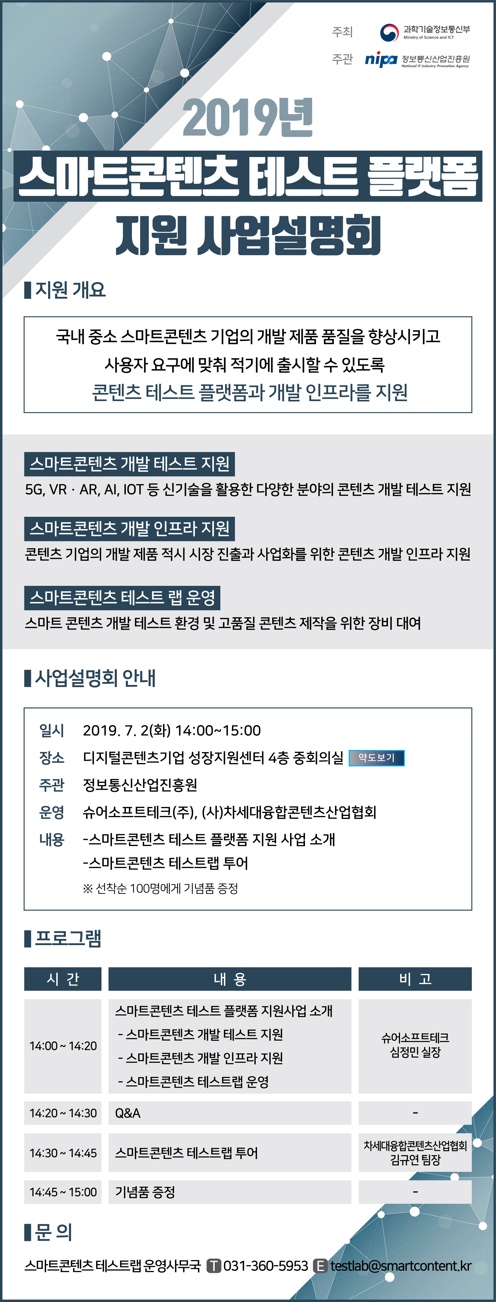 과학기술정보통신부와 정보통신산업진흥원(NIPA)이 내달 2일 오후 2시 안양창업지원센터에서 ‘2019년 스마트콘텐츠 테스트 플랫폼 지원 사업’의 사업설명회를 개최한다.