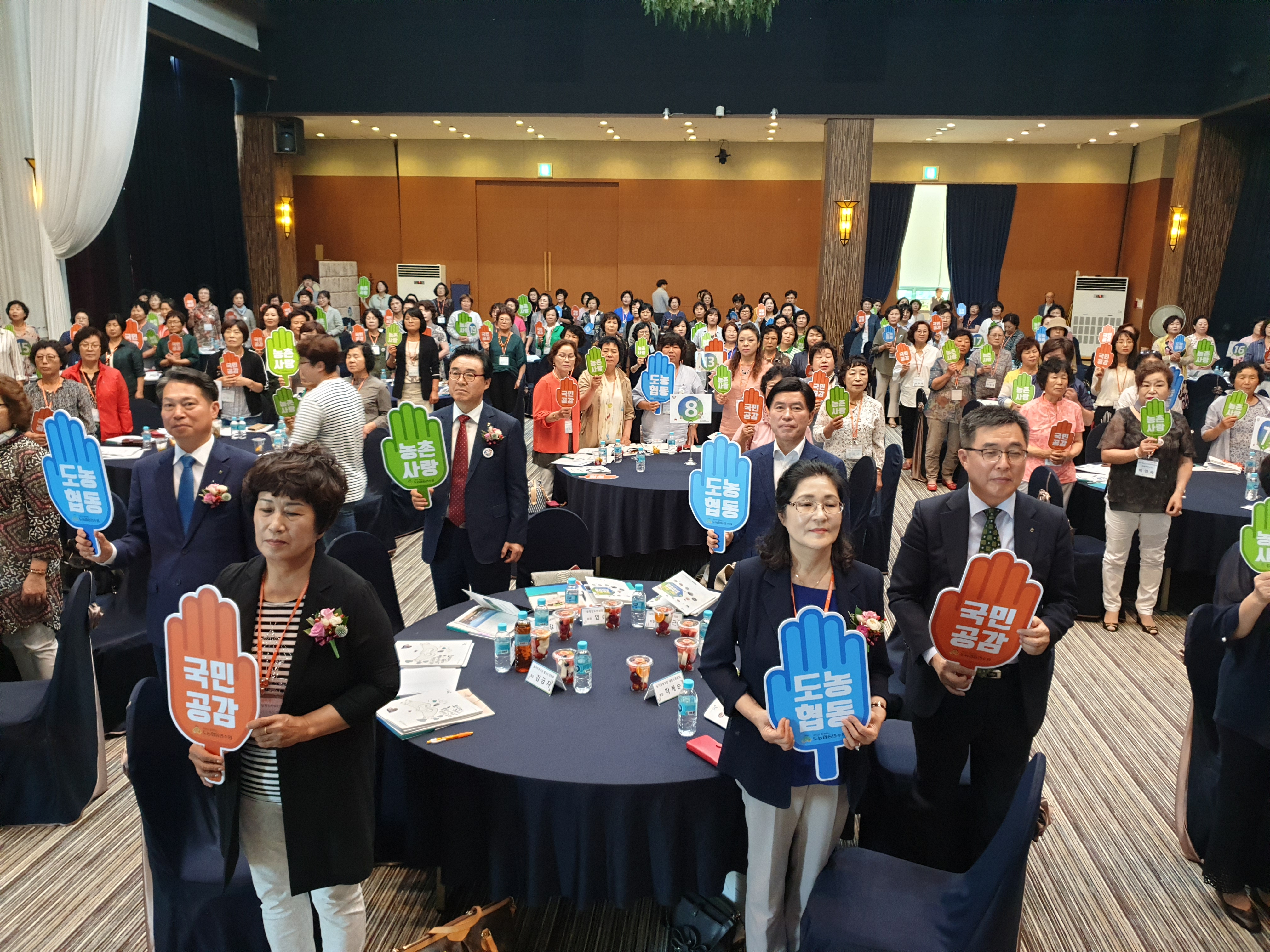 농협중앙회 도농협동연수원이 4일 대전 선샤인호텔에서 ‘2019년 대전·충남 도농협동희망포럼을 개최한 가운데 대전·충남지역 여성단체 임원 등 200여 명이 국민운동 확산 세레모니를 보이고 있다. 포럼에선 농업·농촌의 공익적 가치 이해와 우리농산물 애용 실천 등 아름다운 농촌만들기를 다짐했다. 농협중앙회 대전지역본부 제공