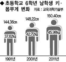 10년 단위 성장속도(초6 남)도 1981~1991년 4.46㎝, 1991~2001년 3.86㎝, 2001~2011년 2.18㎝다.
