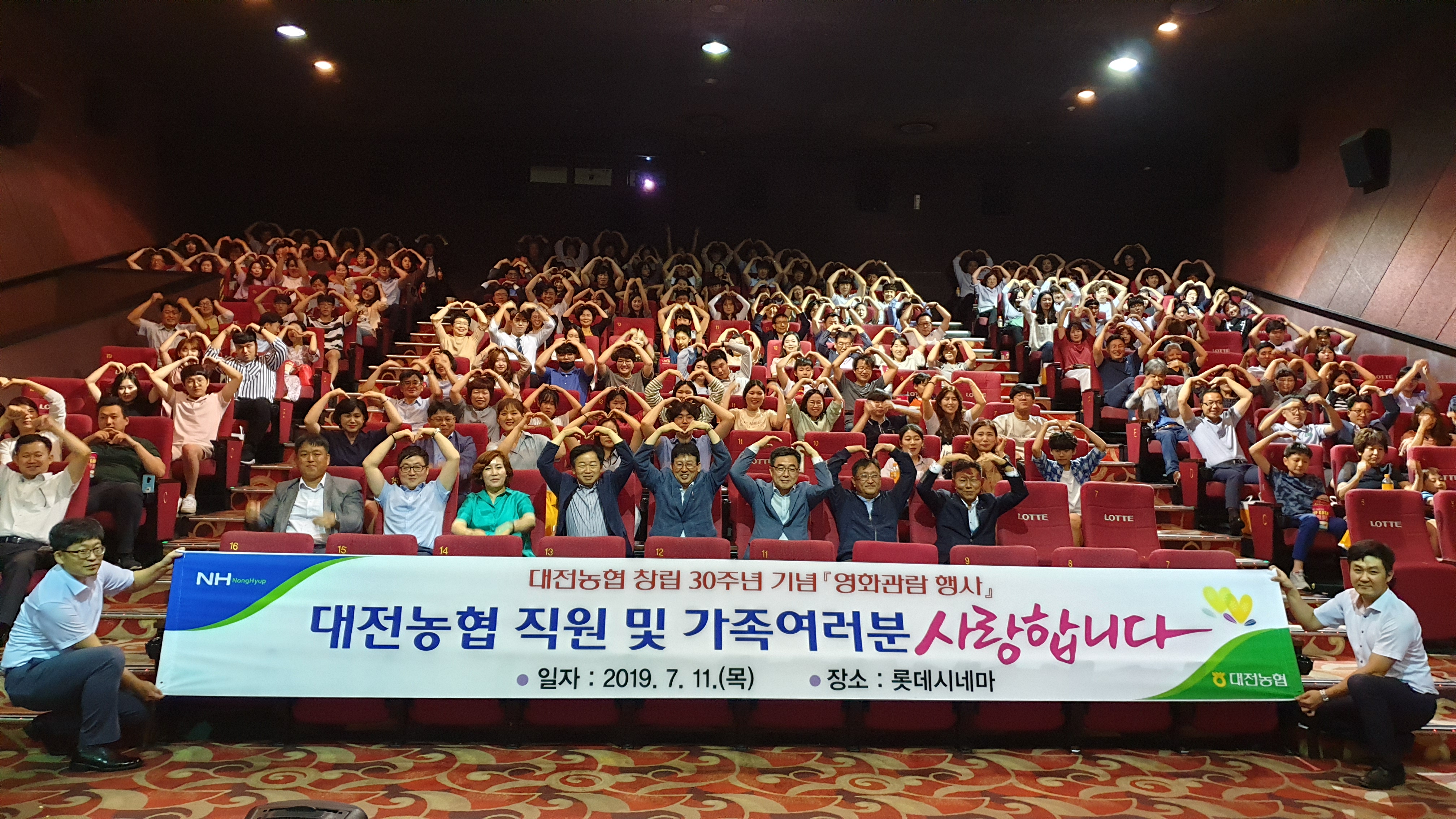 농협중앙회 대전지역본부 관계자들이 지난 11일 롯데시네마 대전점에서 가족초청 ‘영화 관람 행사’를 갖고 기념사진을 촬영하고 있다. 행사는 대전농협 창립 30주년을 기념해 직원 간 소통활성화와 워라밸 조직문화 조성으로 활기찬 대전농협을 만들고 바쁜 업무로 고생한 직원과 가족들을 격려하기 위해 기획됐다.