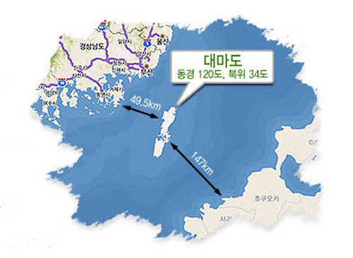 날씨가 좋으면 부산에서 육안으로 관측 가능한 50km거리에 위치한 대마도는 일본 본토보다 한국에 더 가까운 위치에 있는 섬이다. 실제로 부산에서 뱃길로 70분이면 닿는 대마도는 한국역사와 밀접한 관계를 가지고 있는 땅이며 역사적 기록에 따라 대마도의 본 주인은 한국이라 주장하는 이들도 있다. 대마도에 대한 최초의 기록은 중국의 역사서에 남아있다.