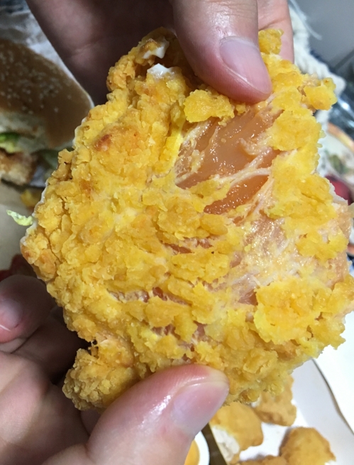 '빅맥 투게더팩'에 포함된 상하이 버거를 두세입 정도 베어 문 뒤 치킨 패티 식감이 이상해 속을 갈라보니 거의 익지 않은 생고기가 들어있었다.