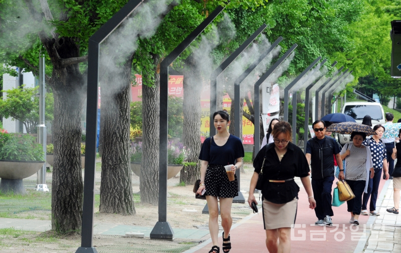 무더운 날씨를 보인 17일 대전시청 북문 앞에 설치된 쿨링포그(Cooling fog) 아래로 시민들이 지나가며 열기를 식히고 있다. 인공 안개비 시설인 쿨링포그(Cooling fog)는 노즐을 통해 물을 안개처럼 분무시켜 물방울이 증발하면서 주변 열기를 빼앗아 온도를 낮추는 시스템이다. 전우용 기자 yongdsc@ggilbo.com