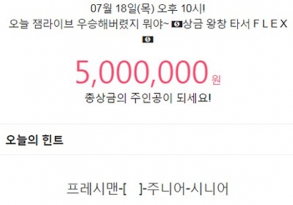 잼라이브 오늘의 힌트, 500만원 상금 주인공은? 힌트는 '프레시맨-[ㅤ]-주니어-시니어'