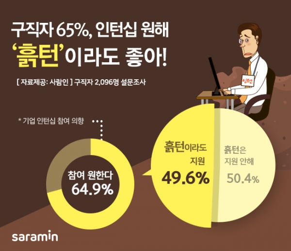 특히, 이들 중 절반(49.6%)은 주요 업무가 아닌 심부름 등 잡무를 담당하는 인턴을 뜻하는 ‘흙턴’이라도 지원할 의향이 있는 것으로 나타났다.