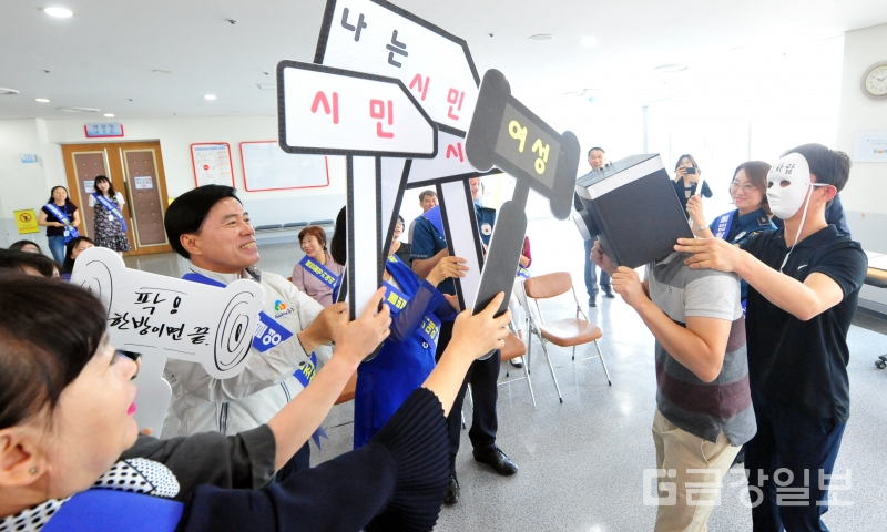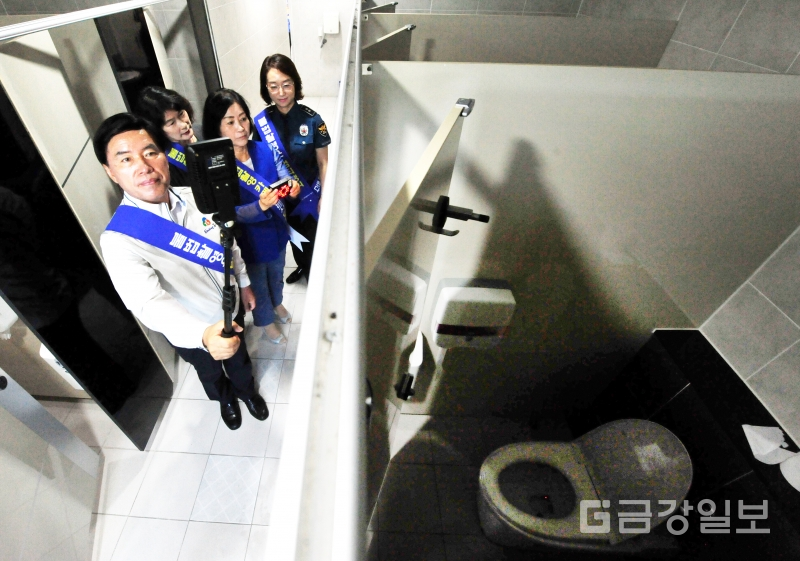 화장실 불법촬영 범죄가 사회적인 문제로 대두된 가운데 23일 대전 동구청 화장실에서 황인호 동구청장과 이나영 구의회의장 등 관계자들이 몰래카메라 탐지장비를 이용해 시연을 하고 있다. 전우용 기자 yuongdsc2ggilbo.com