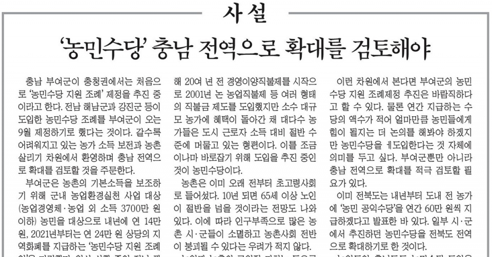충남 부여군이 충청권에서는 처음으로 ‘농민수당 지원 조례’ 제정을 추진 중이라고 한다. 전남 해남군과 강진군 등이 도입한 농민수당 조례를 부여군이 오는 9월 제정하기로 했다는 것이다. 갈수록 어려워지고 있는 농가 소득 보전과 농촌 살리기 차원에서 환영하며 충남 전역으로 확대를 검토할 것을 주문한다.