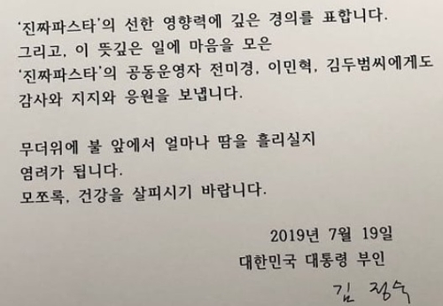 김정숙여사가 파스타 가게에 감사편지를 보낸 사실이 알려졌다.