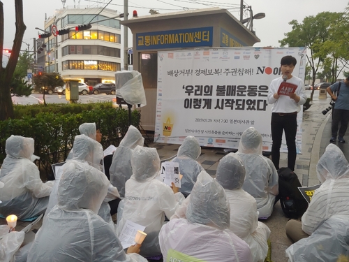 일본의 경제보복 조치에 항의해 불매운동에 참여하고 있는 시민들이 25일 촛불집회를 열고 일본 정부를 규탄했다.