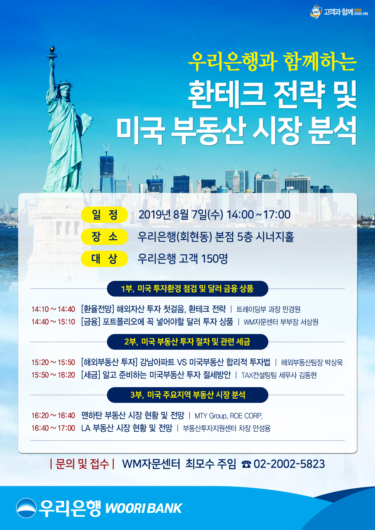 우리은행은 오는 7일 서울 중구 본점에서 ‘환테크전략 및 미국 부동산 시장 분석’ 세미나를 실시한다.