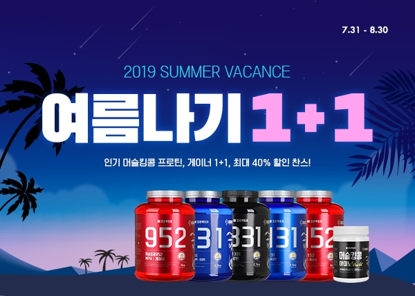 ‘여름나기 1+1’ 이벤트는 ▲프로틴(단백질보충제) 머슬킹콩 1131 ▲게이너(탄수화물보충제) 머슬킹콩 1152 제품을 구매 시 같은 제품을 1통 더 주는 1+1 이벤트다. 또 ▲프로틴 머슬킹콩 1331과 머슬킹콩 부스터 구매 시 40% 추가할인 ▲프로틴 머슬킹콩 731과 머슬킹콩 아미노 플러스 G 구매 시 30% 추가할인 ▲게이너 머슬킹콩 952와 머슬킹콩 아미노 플러스 G 구매 시 30% 추가할인을 해주는 이벤트다.