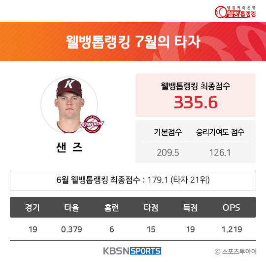 샌즈는 7월 19경기에서 타율 3할7푼9리(66타수 25안타), 6홈런, 15타점, 출루율 4할6푼1리, 장타율 0.758, OPS(출루율+장타율) 1.219를 기록했다. 부문별 순위를 살펴보면, 타율 4위를 비롯해 홈런 공동 2위, 출루율 3위, 장타율 1위, OPS 2위 등 주요 타격 지표 상위권에 이름을 올렸다.