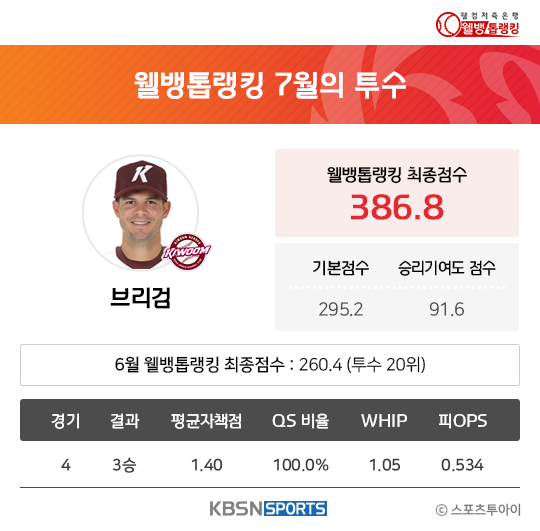 샌즈가 키움 타선을 이끌었다면, 마운드는 브리검이 선두 지휘했다. 7월 4경기 모두 퀄리티스타트(선발 6이닝 이상 3자책 이하)를 달성한 브리검은 3승, 평균자책점 1.40을 나타내며 웰뱅톱랭킹 점수 386.8점을 쌓았다.