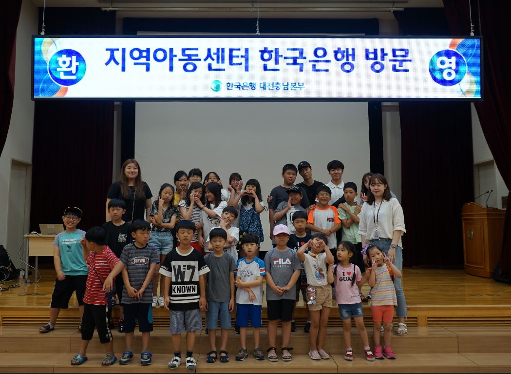 한국은행 대전충남본부가 지난 9일 충남 천안 소재의 한 아동센터에서 실시한 여름방학 경제캠프 참가자들이 기념사진을 촬영하고 있다. 참가 아동들은 금융경제교육과 화폐박물관을 견학했다. 한은 여름방학 경제캠프는 이달 3회에 걸쳐 실시된다.
