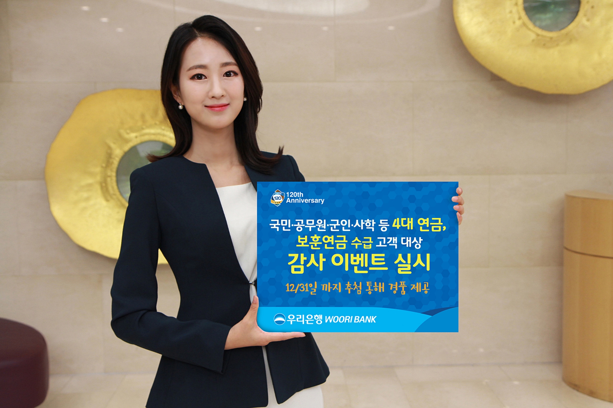 우리은행이 올해 말까지 4대 연금·보훈연금 수급고객 감사 이벤트를 실시한다. 해당 연금수급 계좌를 1건 이상 우리은행으로 등록하고 연금 수급계좌로 2개월 이상 신규이체 받으면 자동응모 된다. 계좌 등록·변경은 고객이 각 공단 고객센터를 통해 신청할 수 있다.