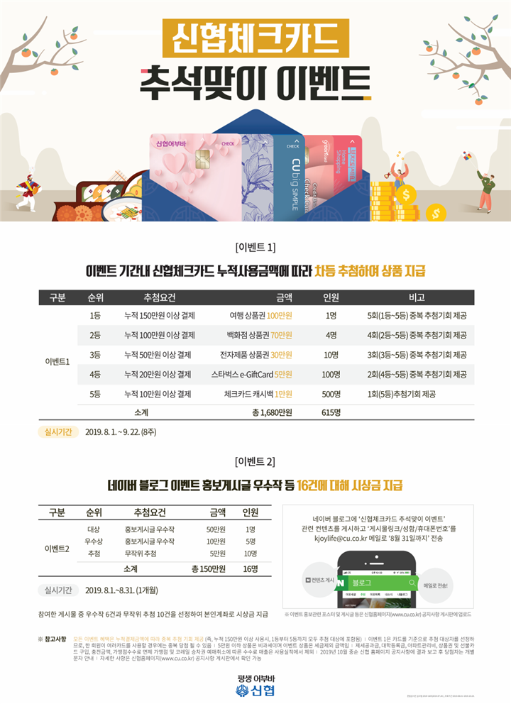 신협중앙회가 내달 22일까지 ‘신협체크카드 추석맞이 이벤트’를 진행한다.