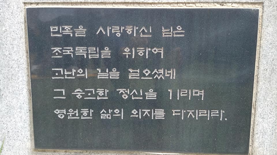 ‘민족(民族)을 사랑하신 님은 조국독립(祖國獨立)을 위하여 고난의 길을 걸으셨네. 그 숭고한 정신을 기리며 영원한 삶의 의지를 다지리라.’