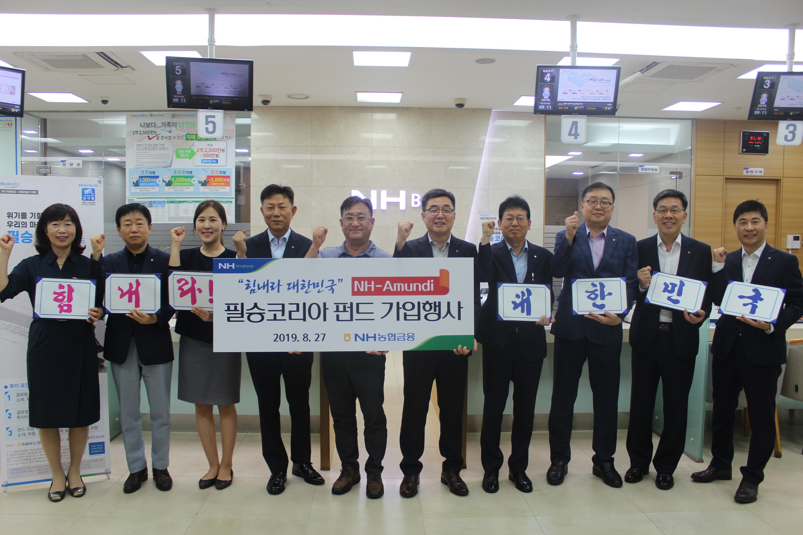전용석 농협대전지역본부장(왼쪽 여섯 번째)이 27일 ‘HN-Amundi 필승코리아 주식형 펀드’를 홍보하고 있다. 해당 펀드는 글로벌 무역 여건 변화로 경쟁력 강화가 시급한 부품·소재·장비 관련 기업들에 주로 투자하는 주식형이다. 운용보수의 50%를 기금으로 적립된다. 농협중앙회 대전지역본부 제공