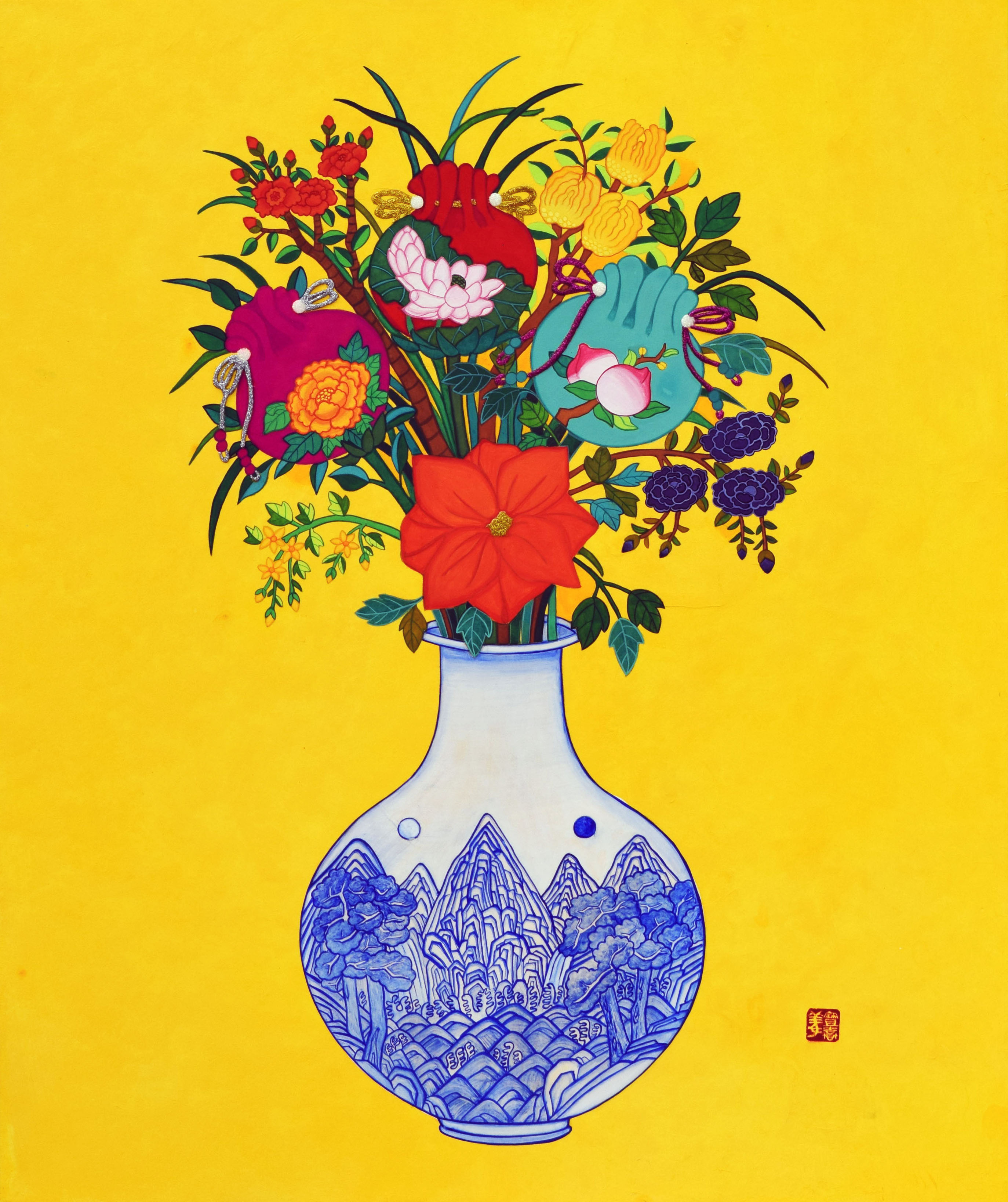 화병에 형형색색 꽃들이 담겨져 있다. 인간이라면 꽃을 보고 누구나 질투심이 일어난다. 꽃과 관련된 비유를 보면 안다. 인간이 얼마나 꽃 같은 세월을 보내고 싶어 하는지. 꽃은 비유의 꽃이다. 나는 작품에서 꽃이 꽃으로 보이지 않고 사람으로 보인다. 행복하게 피고 싶은 사람들의 마음을 알기 때문에 그런 것 같다. <김희정 대전미룸갤러리 관장>