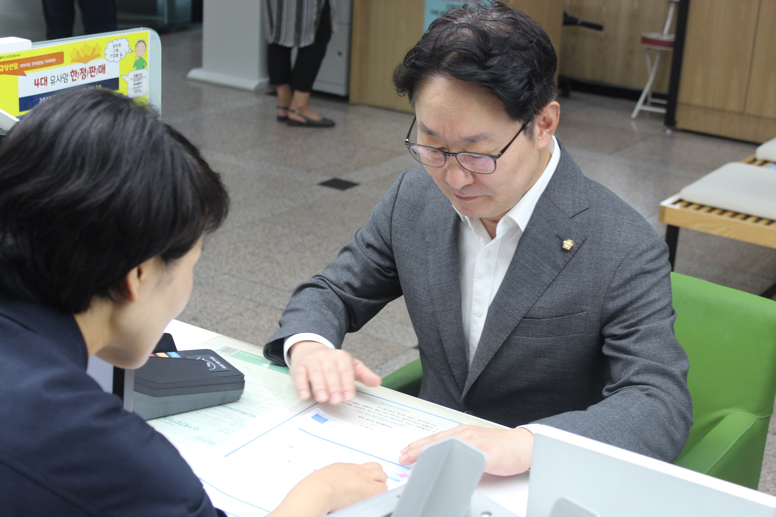 더불어민주당 박범계 의원(대전 서구을)이 지난달 30일 서구에 있는 농협은행을 찾아 ‘필승코리아펀드’에 가입하고 있다. 이 상품은 소재·부품·장비관련 국내기업에 주로 투자하는 주식형 펀드다. 농협중앙회 대전지역본부 제공