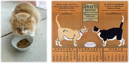 사람들은 고양이에게 정기적으로 충분한 먹이를 주어야 한다고 생각하게 되었습니다. 오트밀 죽, 우유에 적신 빵이나 생선, 버터 등을 고양이에게 주었는데요. 상업적으로는 개 비스킷을 만드는 것으로 시작된 스프렛츠 라는 회사에서 처음으로 고양이 사료를 생산하게 되었고, 이어 퓨리나에서도 1862년 고양이 사료를 생산합니다.