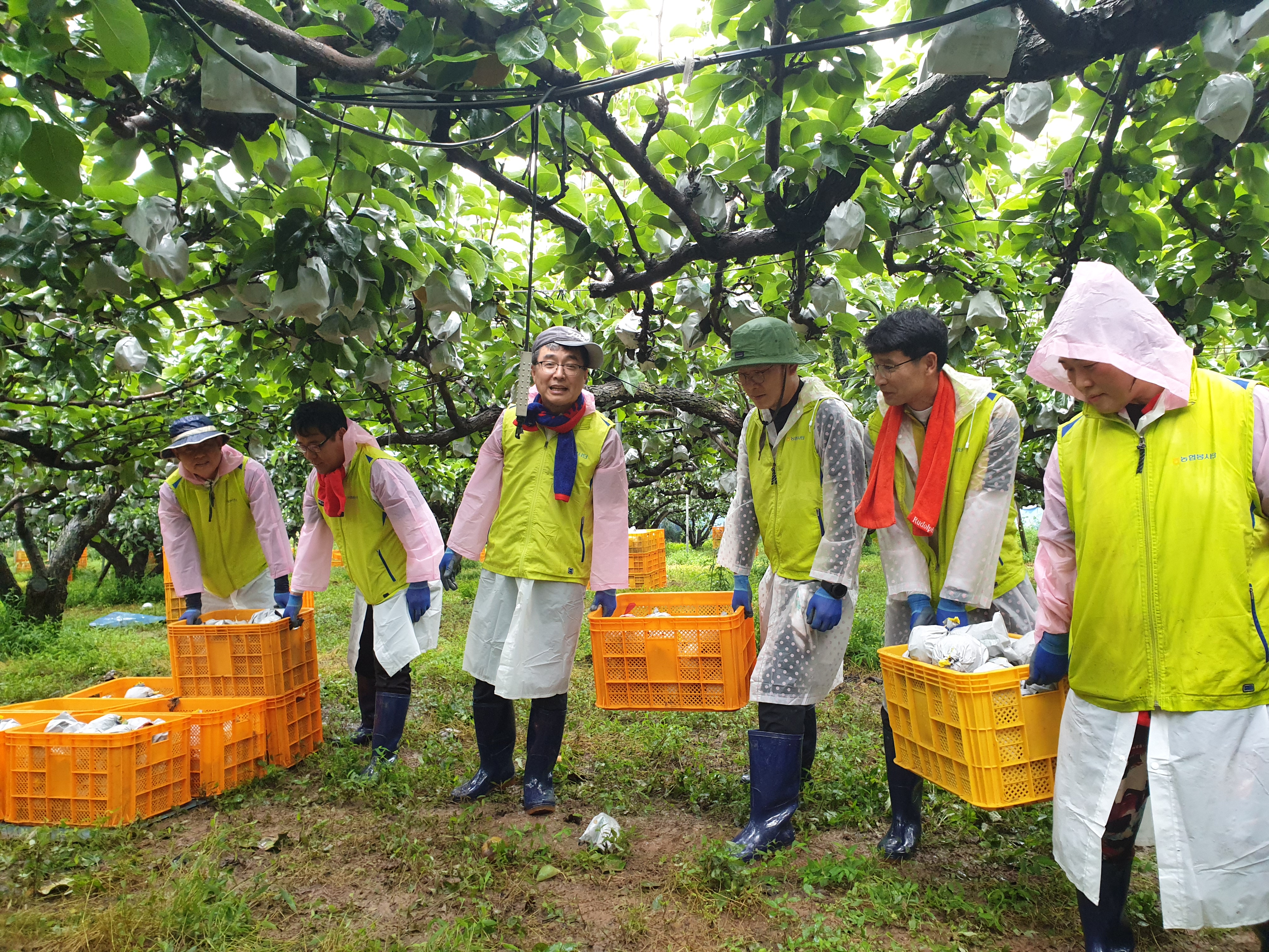 전용석 농협중앙회 대전지역본부장(왼쪽 세 번째)이 9일 태풍으로 낙과 피해를 입은 유성구의 한 배 농가를 찾아 긴급재해복구 차원에서 일손을 돕고 있다. 전 본부장을 포함한 대전농협 임직원들은 떨어진 배를 수거하는 등 농가의 피해를 최소화하기 위해 구슬땀을 흘렸다. 농협중앙회 대전지역본부 제공